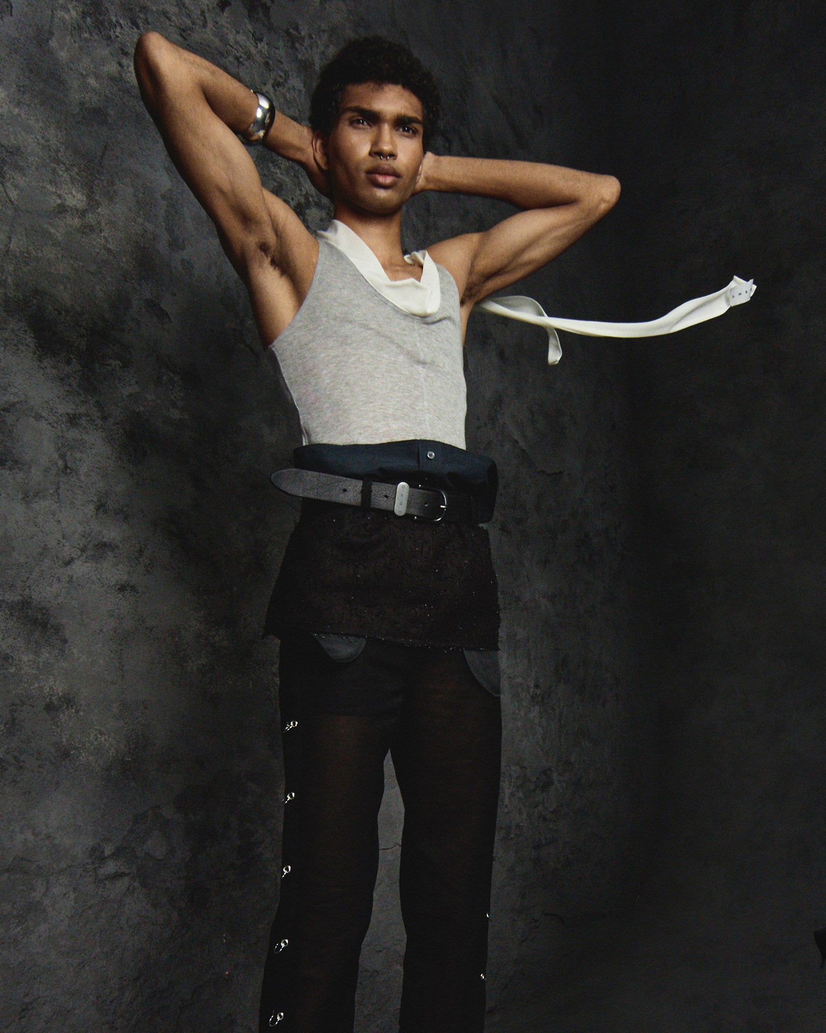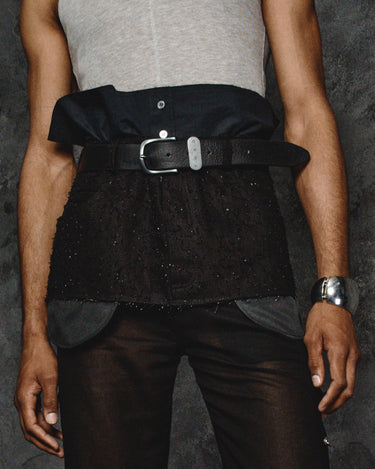 A waist accessory utilizing trompe l’oeil to mimic layered shirt and denim elements. Crafted from Japanese cotton and textured denim, the form functions as a sculptural tool to redefine the proportions of the silhouette.