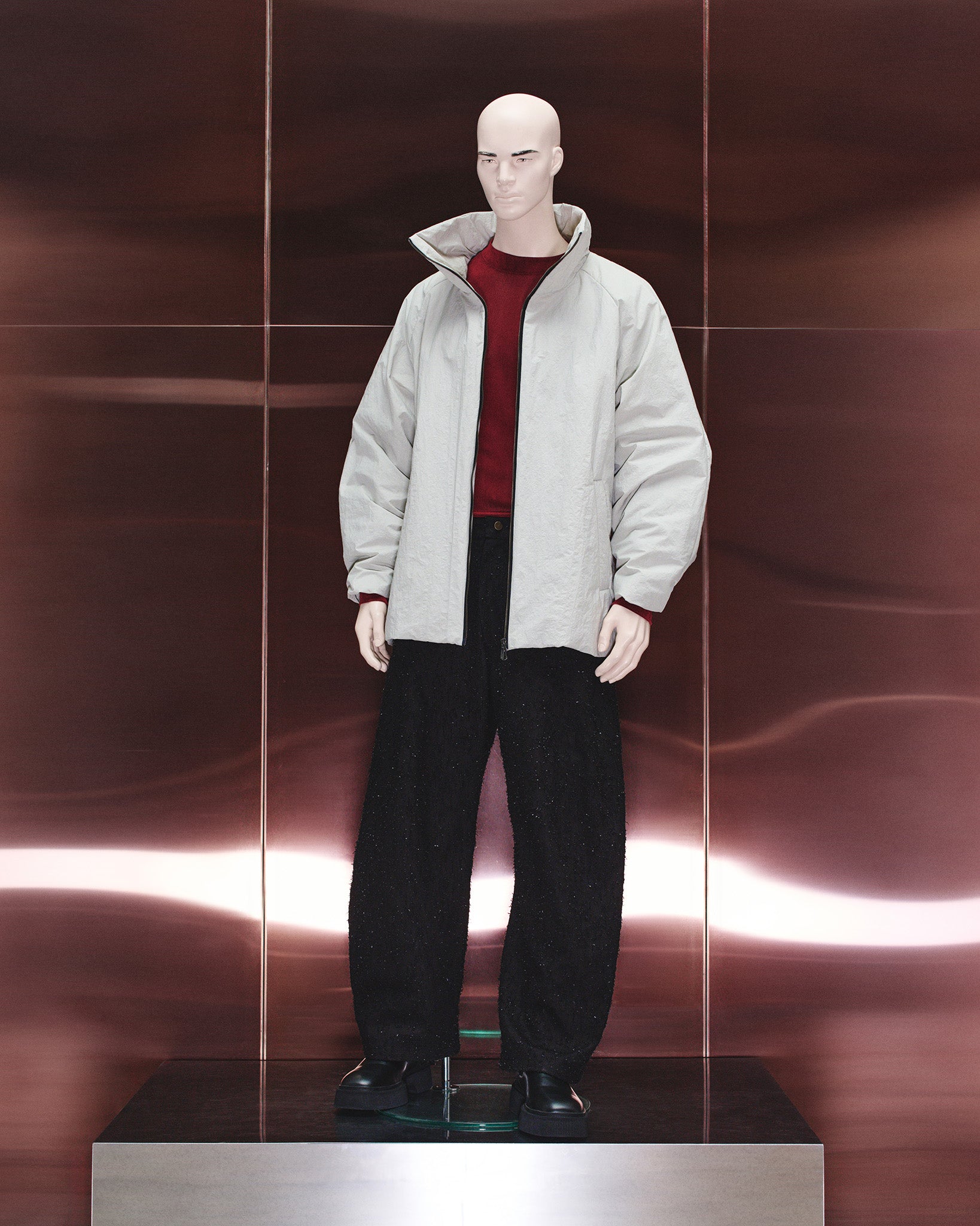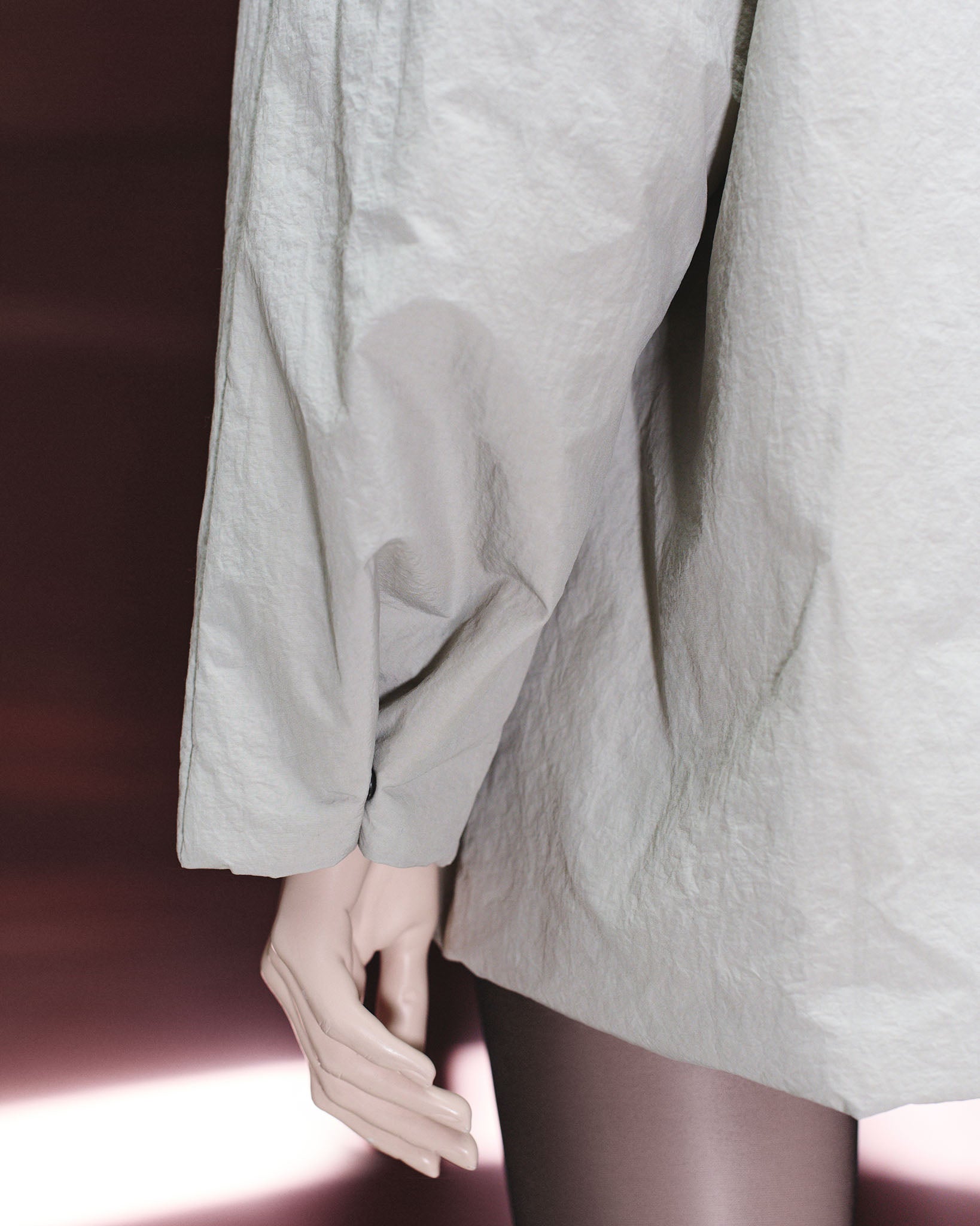 The Shelter Parka is an architectural study in volume and protection, designed as a modern shield. It is crafted from a crisp Japanese taffeta, a material renowned for its lightweight structure, smooth hand-feel, and water-resistant properties. Lightly insulated, it offers a sophisticated solution for transitional weather, combining a contemporary, oversized silhouette with practical functionality for versatile, everyday styling.