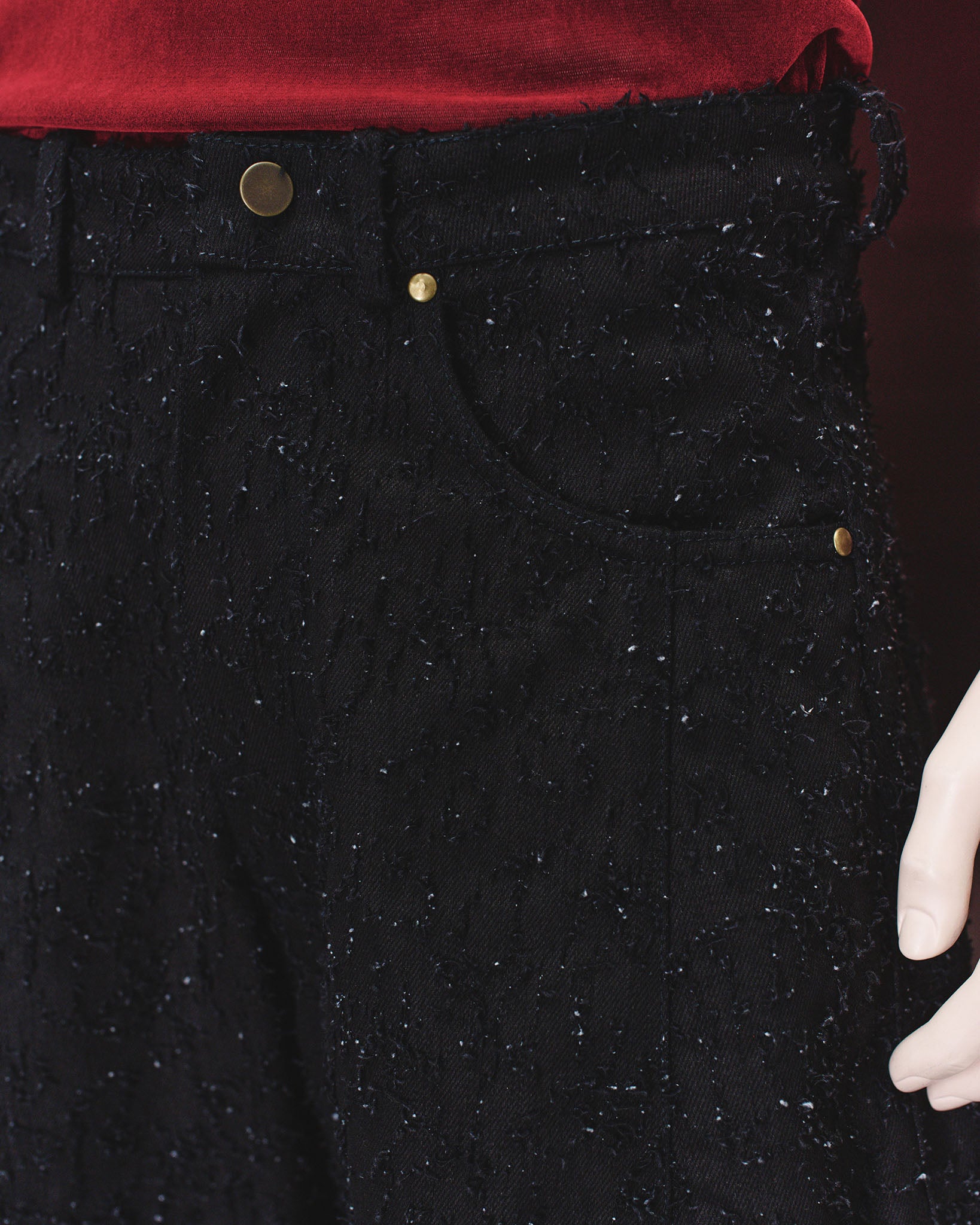 The Umbra Jeans are an exploration of material and shadow, offering a modern interpretation of oversized tailoring. They are constructed from a unique textured black denim, a material distinguished by its intricate, tactile surface and its deep, light-absorbing hue. This garment merges a relaxed, flowing form with a compelling finish, creating a statement piece that is both visually and physically engaging.