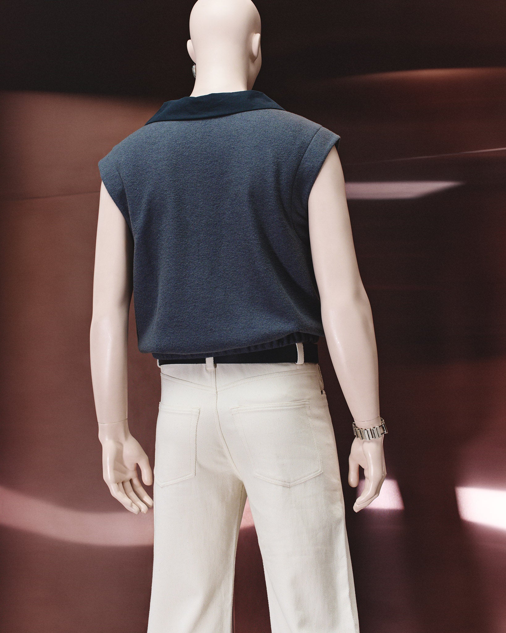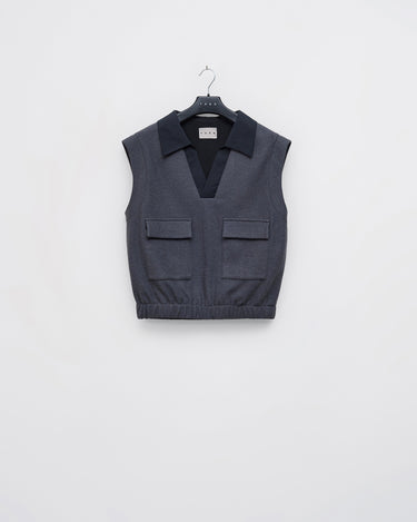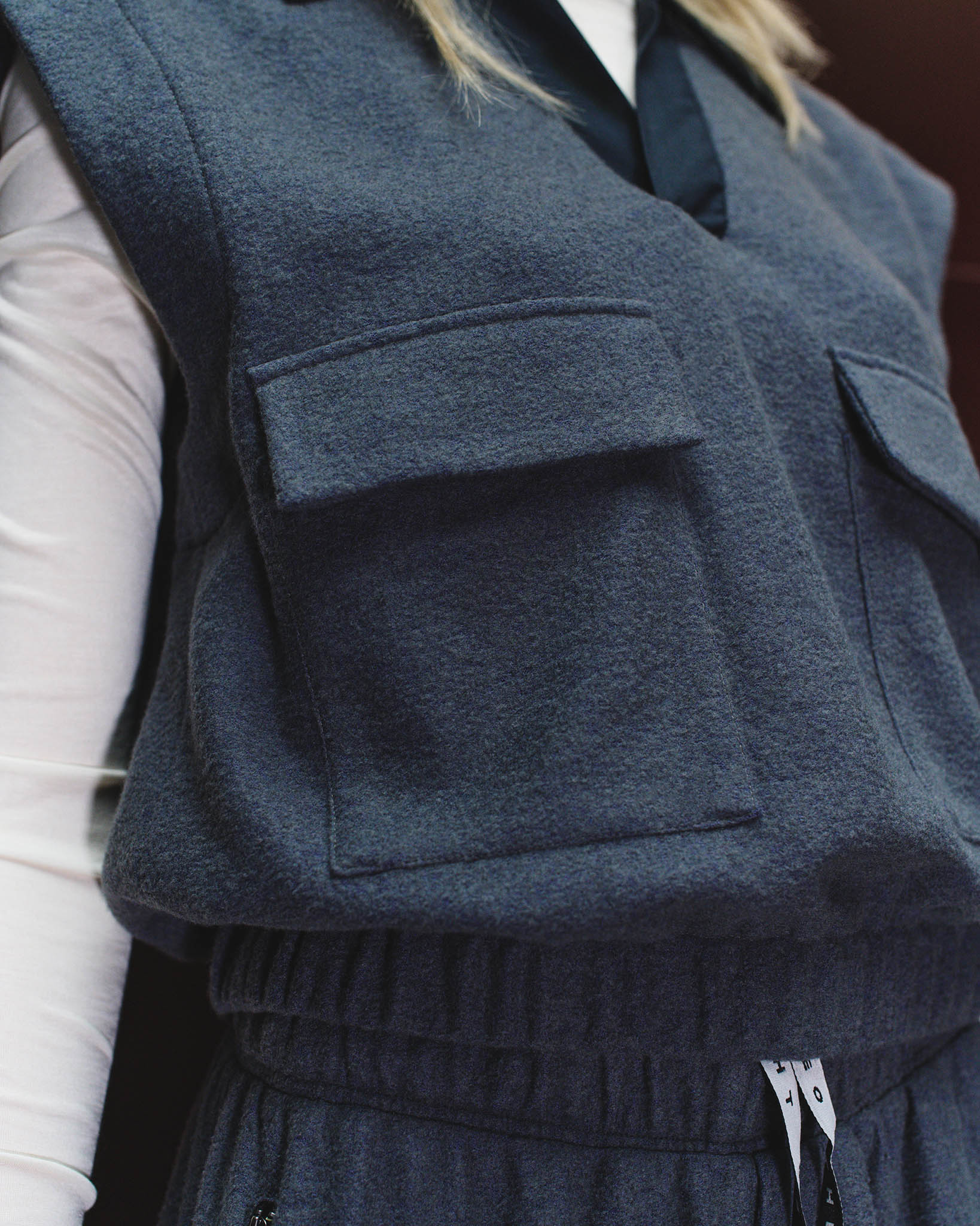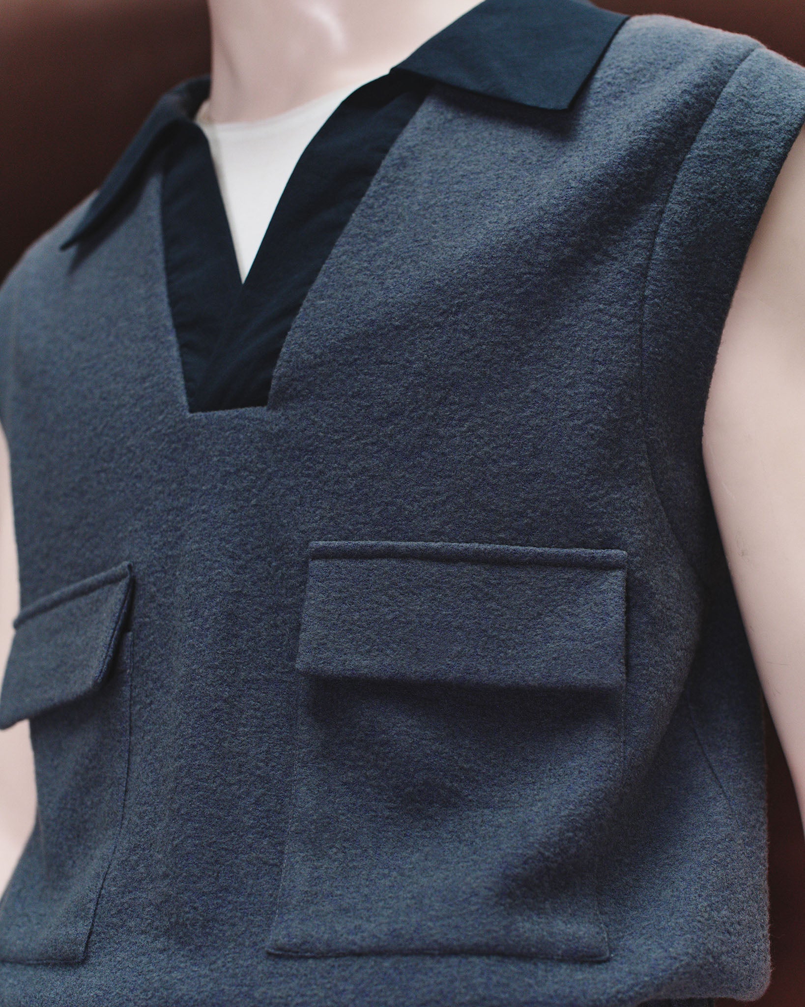 The Shell Vest offers a modern approach to layering, blending utilitarian details with luxurious comfort. It is crafted from a premium Japanese woolen blend, celebrated for its soft, cozy texture and substantial feel. Its intentionally oversized silhouette is defined by a prominent pointed collar and dropped shoulders, creating a strong yet relaxed frame. Fully lined and finished with an elasticated hem, this vest is the ultimate piece for adding textural depth and contemporary edge to any look.
