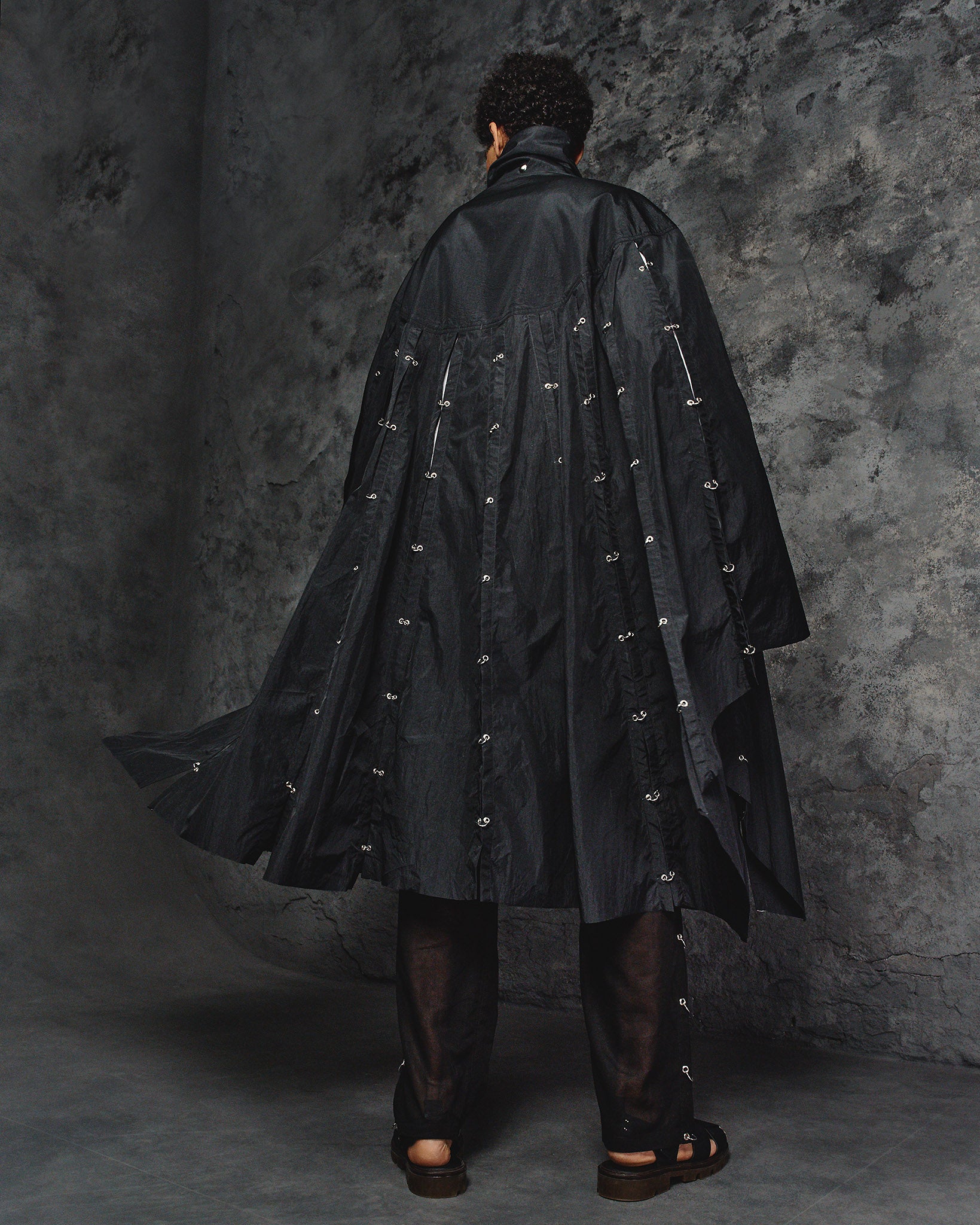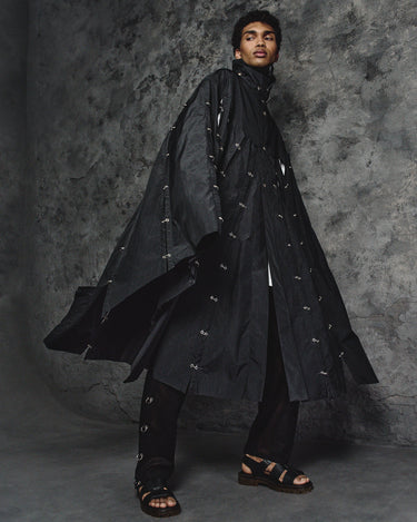 The Fragment Coat is a bold fusion of utilitarian function and experimental form, offering a radical reinterpretation of classic outerwear. It is crafted from a crisp black Japanese nylon, distinguished by its lightweight structure and a subtle technical sheen. The garment's defining feature is its deconstructed build: the front and back are sliced into vertical strips, then meticulously reassembled using metal eyelets and rings, creating a piece that is both protective and artfully exposed.