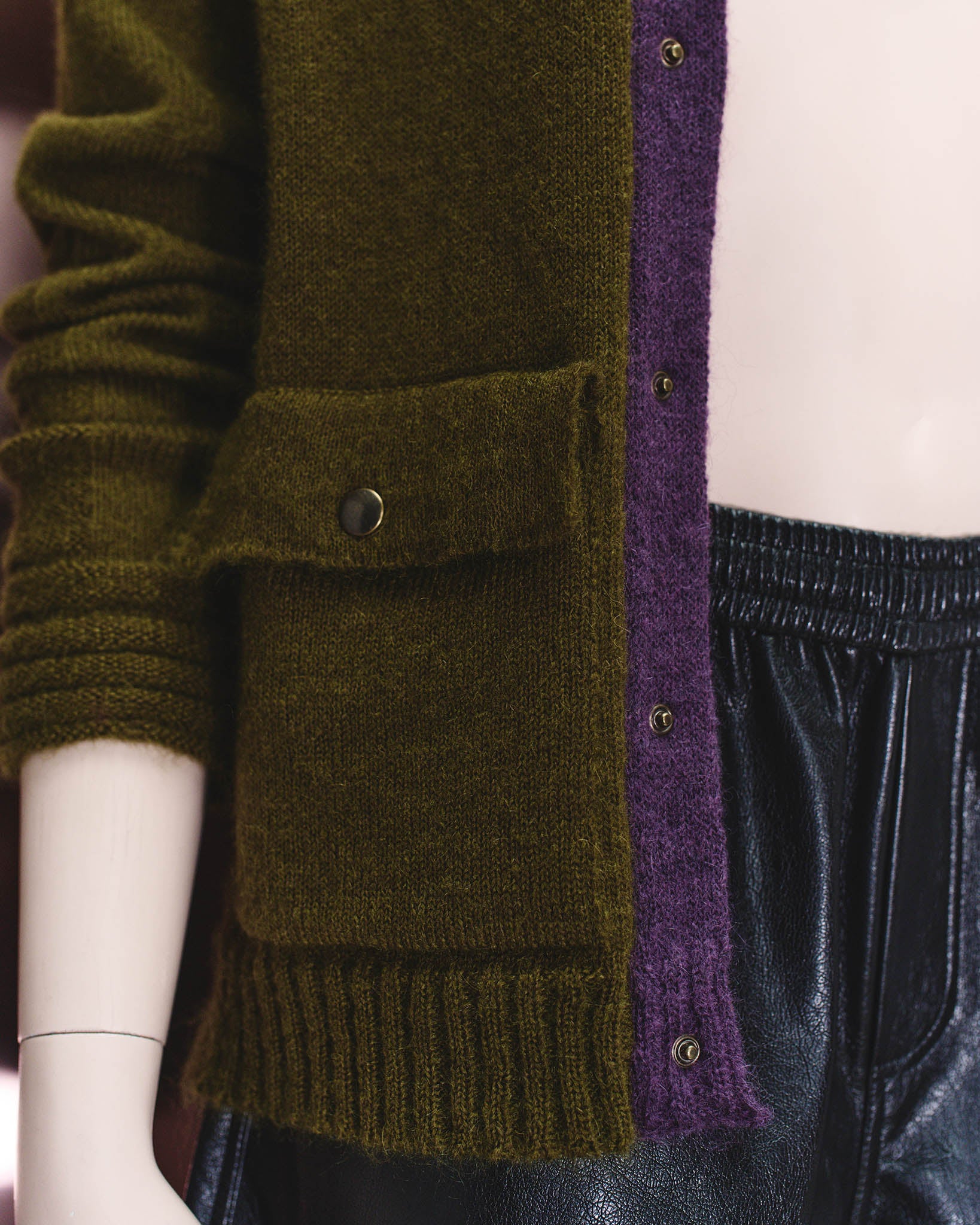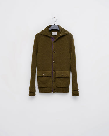 The Cardigan is a modern heirloom, blending rustic, tactile knitting with a bold, contemporary silhouette. It is crafted from a warm and lofty blend rich in kid mohair and merino wool. Its most striking feature is the voluminous high stand collar, offering a cozy and protective feel. A subtle contrasting knitted stripe on the inner placket adds a flash of hidden character to this versatile piece.