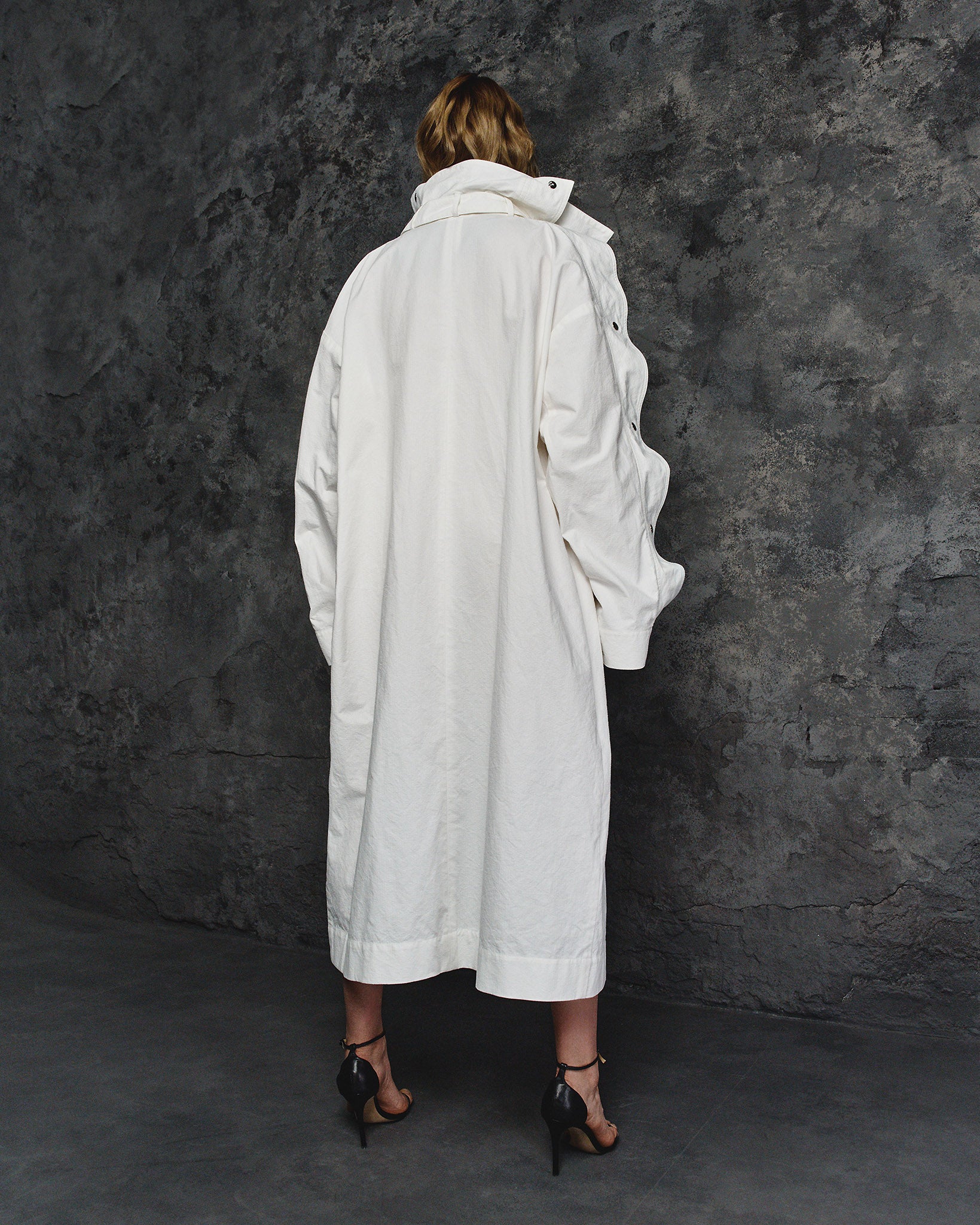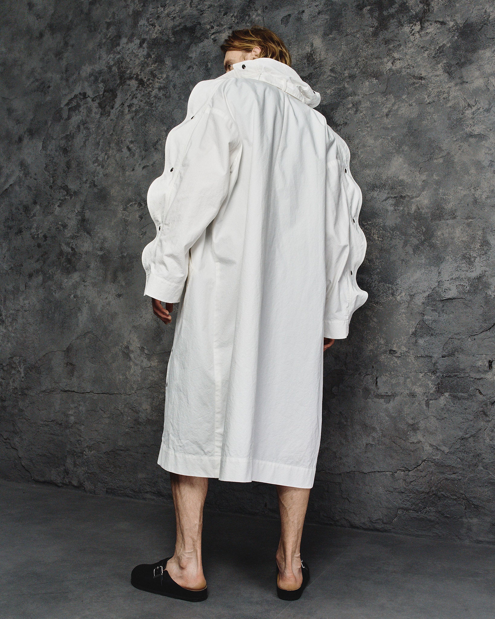 The oversized unisex overcoat in water-repellent Japanese Cordura. The form is defined by signature wavy sleeve, creating a sense of motion. A voluminous shield designed for structural presence in any environment.